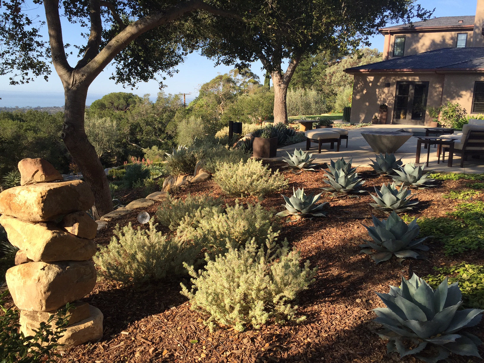 • Sweeps of Agave ‘Blue Glow’, Agave ovatifolia ‘Frosty Blue’, Westringia fruticosa ‘Morning Light’, and Senecio Crassissimus