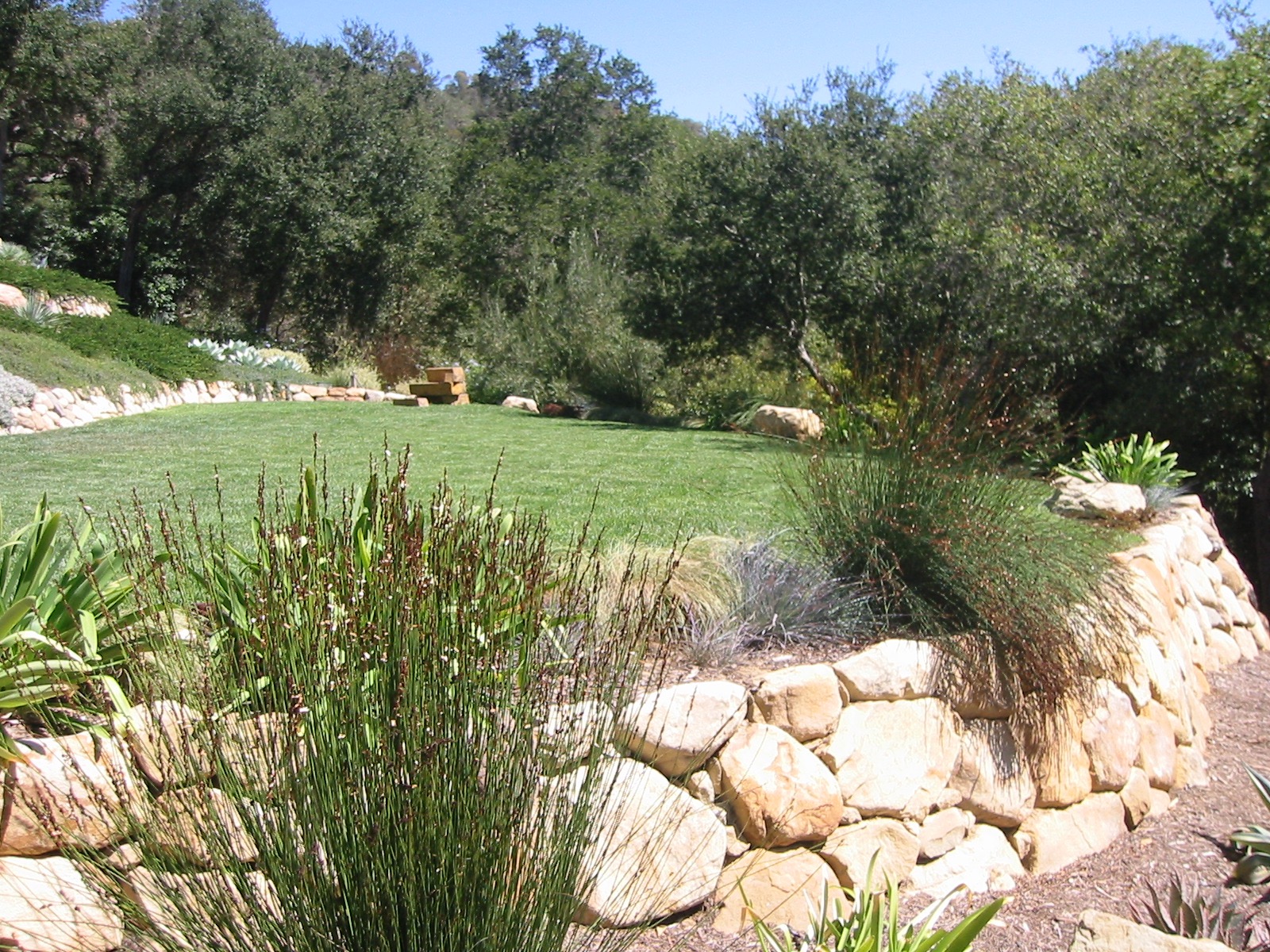 Reinventing an area of this size, geography, and prominence proved challenging. We rejected artificial grass as environmentally unsound, and dismissed native grass as too thirsty and seasonally unappealing. Instead we imagined ways to: 1) use minimal irrigation, 2) feature the rare flatness, and 3) converge to ocean and Channel Island views over the live oak canopies.