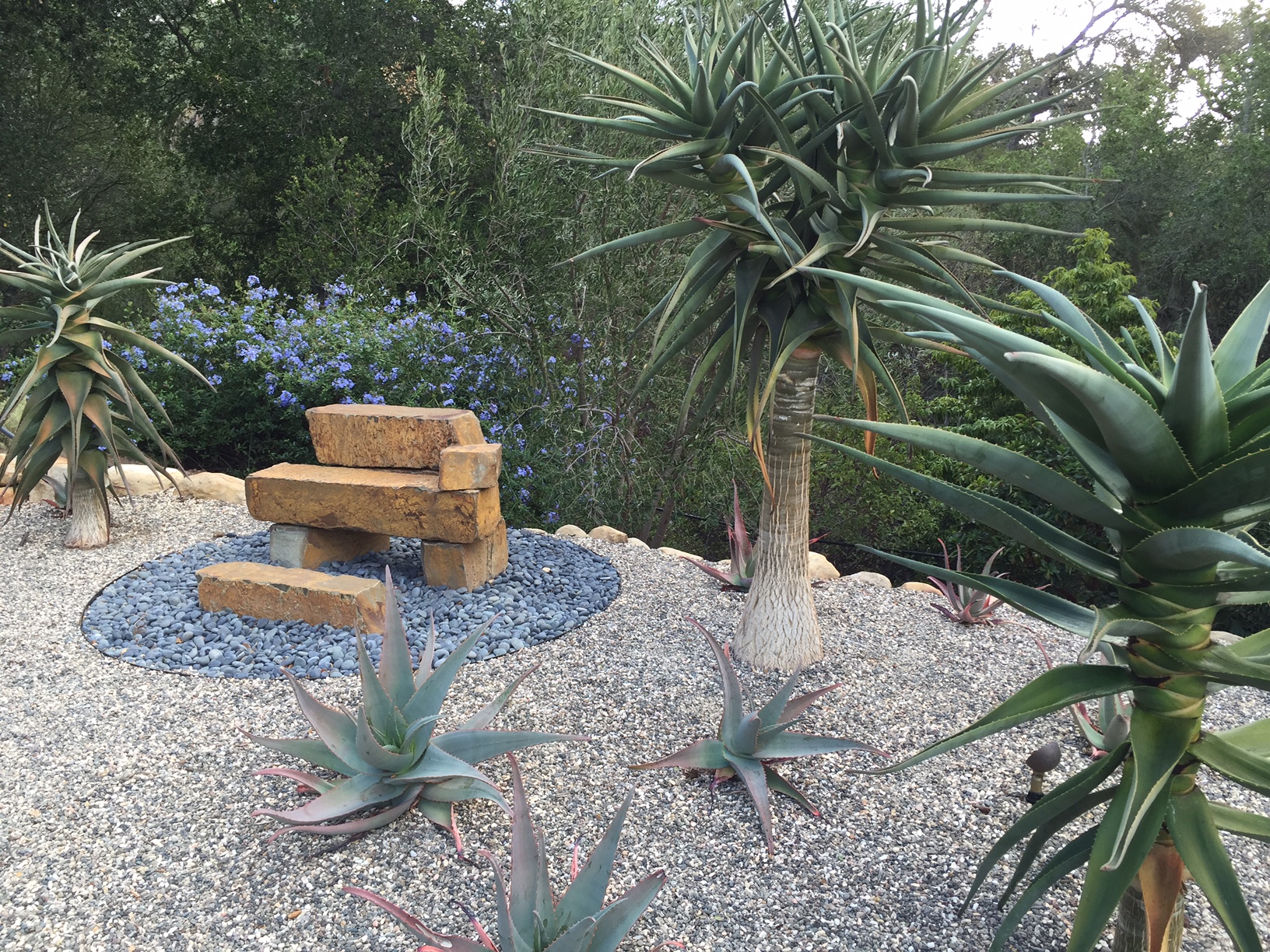 - Bed of Aloe Hercules and A. rubroviolacea for funky stone bench