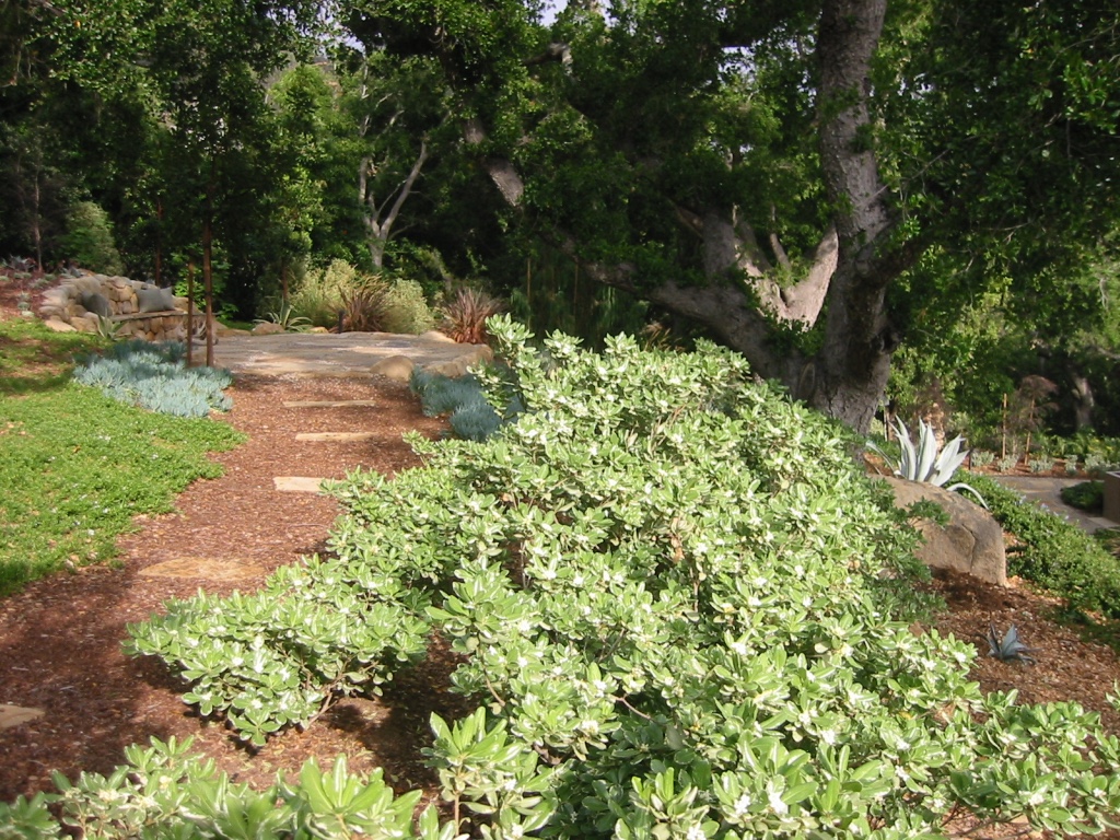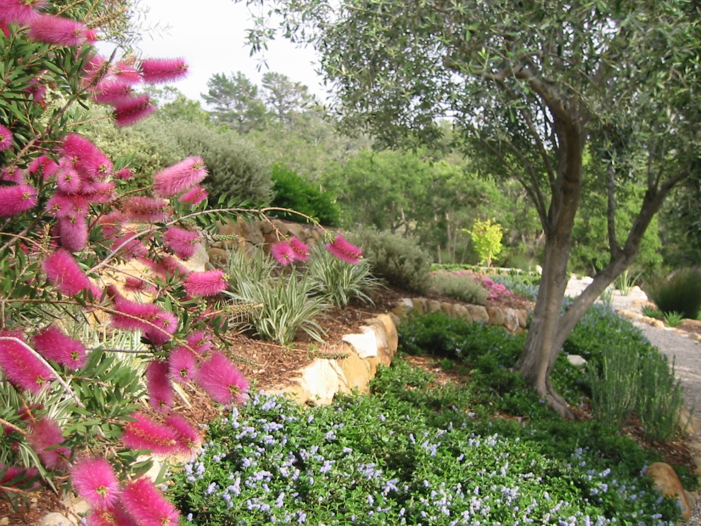 The next question was why, besides to preserve resources for the next generation, would a gardener choose to cut consumption? I answered that it seems counterintuitive but it makes gardens better. Proof positive is the photos below and on the right of plantings a few months to 3 years old with so little irrigation amid 4 years of drought. That’s waterwise gardening in practice.