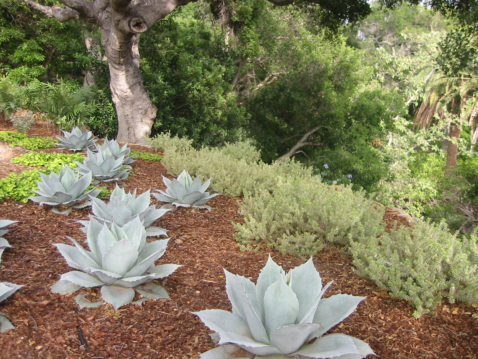 Fierce winds toppled our 36” diameter, 100-year-old, double-trunked live oak last week. The massive tree grazed smaller live oaks as it fell, crushed 3 Prunus ilicifolia ssp lyonii, stripped the leaves off 5 Plumbago auriculata ‘Imperial Blue,’ and shredded 6 Agave ovatifolia ‘Frosty Blue.’