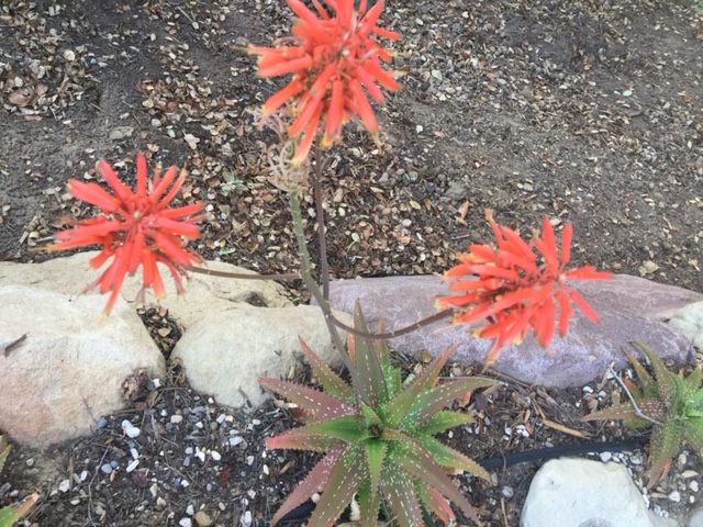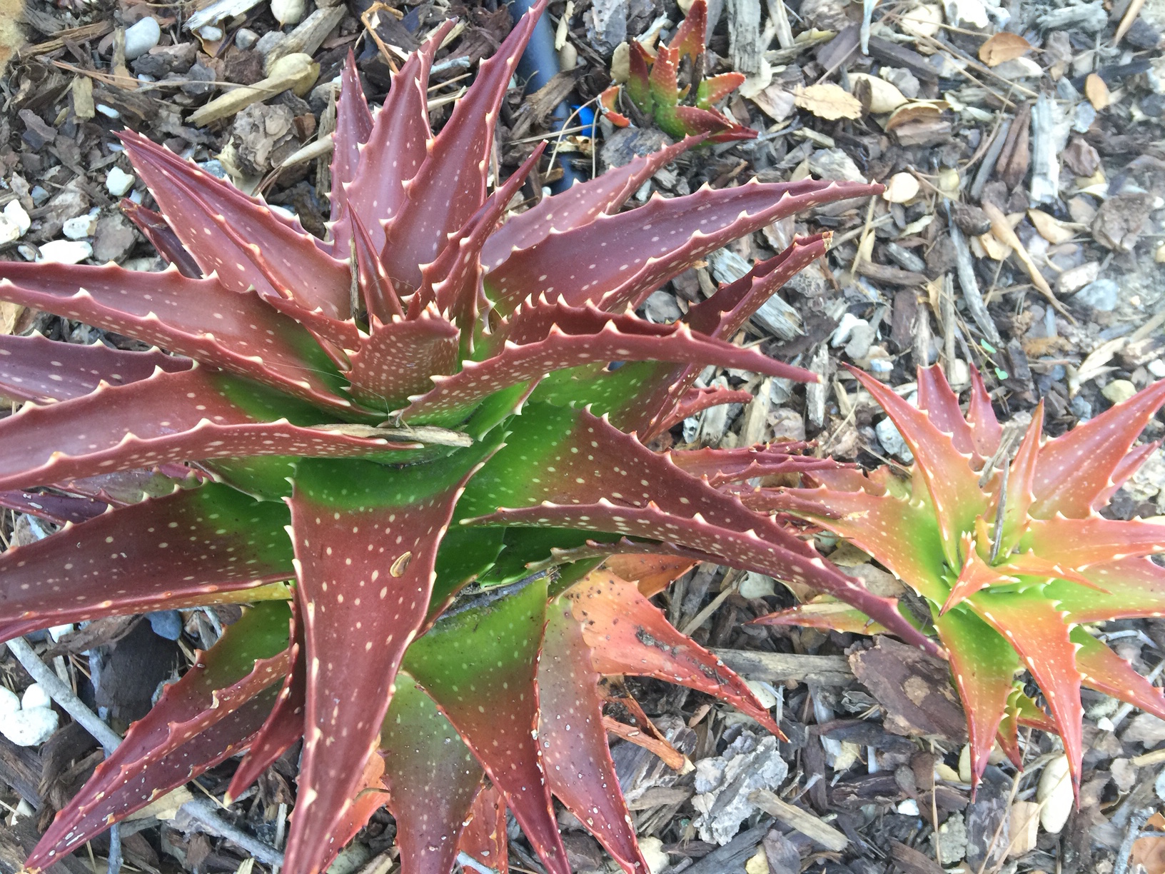 This brilliantly-colored aloe reportedly clumps to 20″ wide rosettes. Ours have not grown that big, but they survived in a sliver of shallow soil along a sloped gravel path with twice-monthly hand watering in drought. Their pups recently replaced a less-successful variety in the sliver, and we rewarded all 36 stalwart souls with low-flow drip emitters. Aloe mites since attacked 2, but thankfully the scourge did not spread.