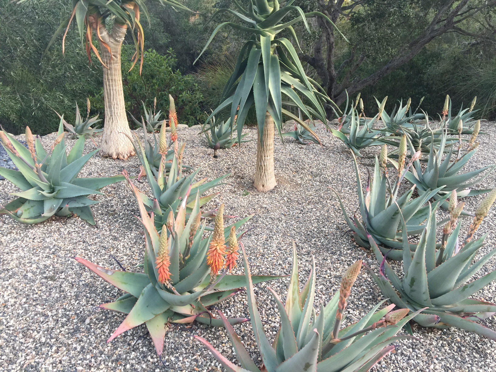 Three cheers for aloes – they come in a range of sizes and shapes, flower on occasion, and need little water. They don’t die like agaves do after blooming, although they can get devastating aloe mites aka ‘cancer‘. Not counting tree aloes (one with trunks), my 3 favorites of 24 varieties currently in our garden are: