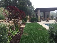 AFTER photos below show that even small lawn conversions boost function, beauty, and conservation. Highlights are a stone bench set in the same Cherokee Creek flagstone used nearby. Agapanthus Queen Mum and Euphorbia cotinifolia repeat from the adjacent bed, accented by Pedilanthus bracteatus and Yucca ‘Blue Boy.’ The grass is 7’ by 26’ so smaller radius rotators and 1 less spray head suffice, and water use is 30% less.
