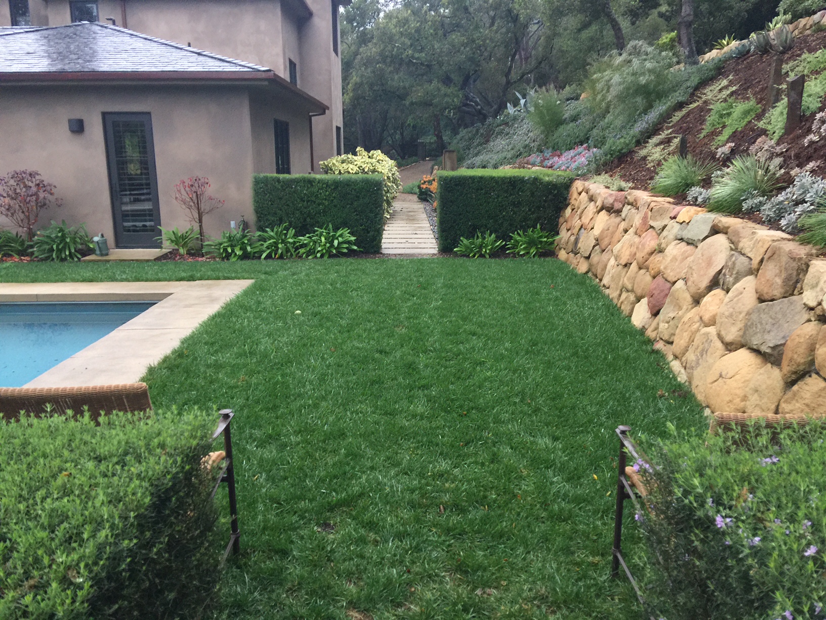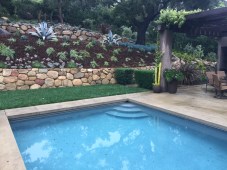 Then 4 months ago, I shrunk the strip shown in BEFORE photos below. My motivation was to soften and better integrate the 10-13′ by 30′ lawn between the pool and stone wall. The tapered green swath felt off-balance, and the wall with a steep slope and another wall above looked severe.